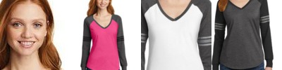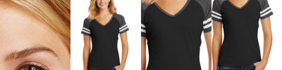 A home-run style with mesh and solid print stripes on the sleeves. 4.5-ounce, 60/40 ring spun combed cotton/poly, 32 singles Crossover v-neck Curved hem